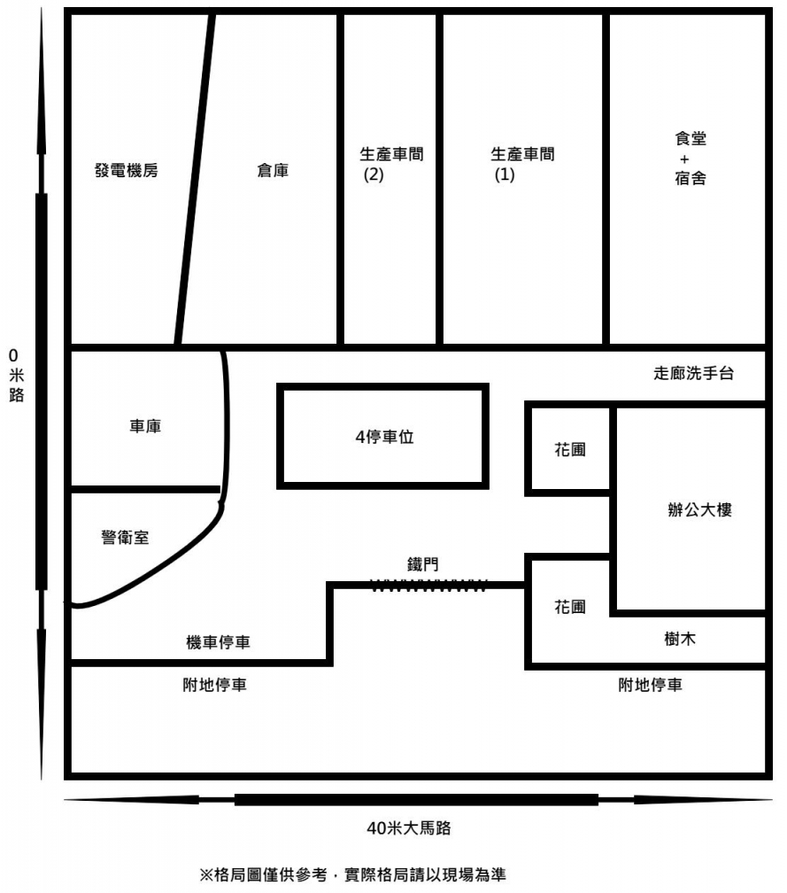 3.目前區分辦公室.廠房.生產車間區.守衛室.宿舍.發電機.食堂